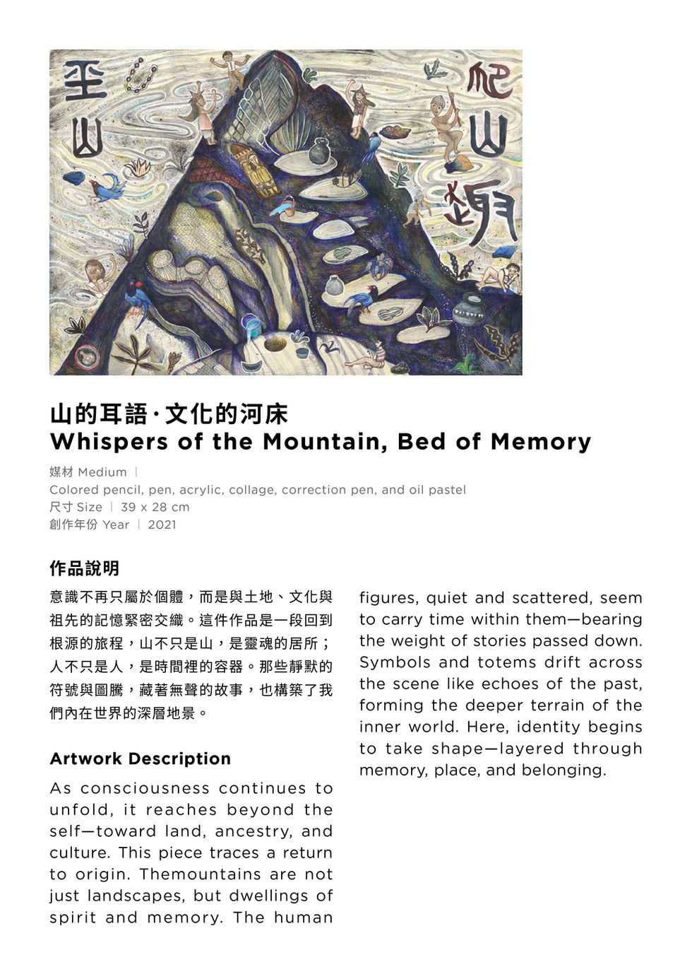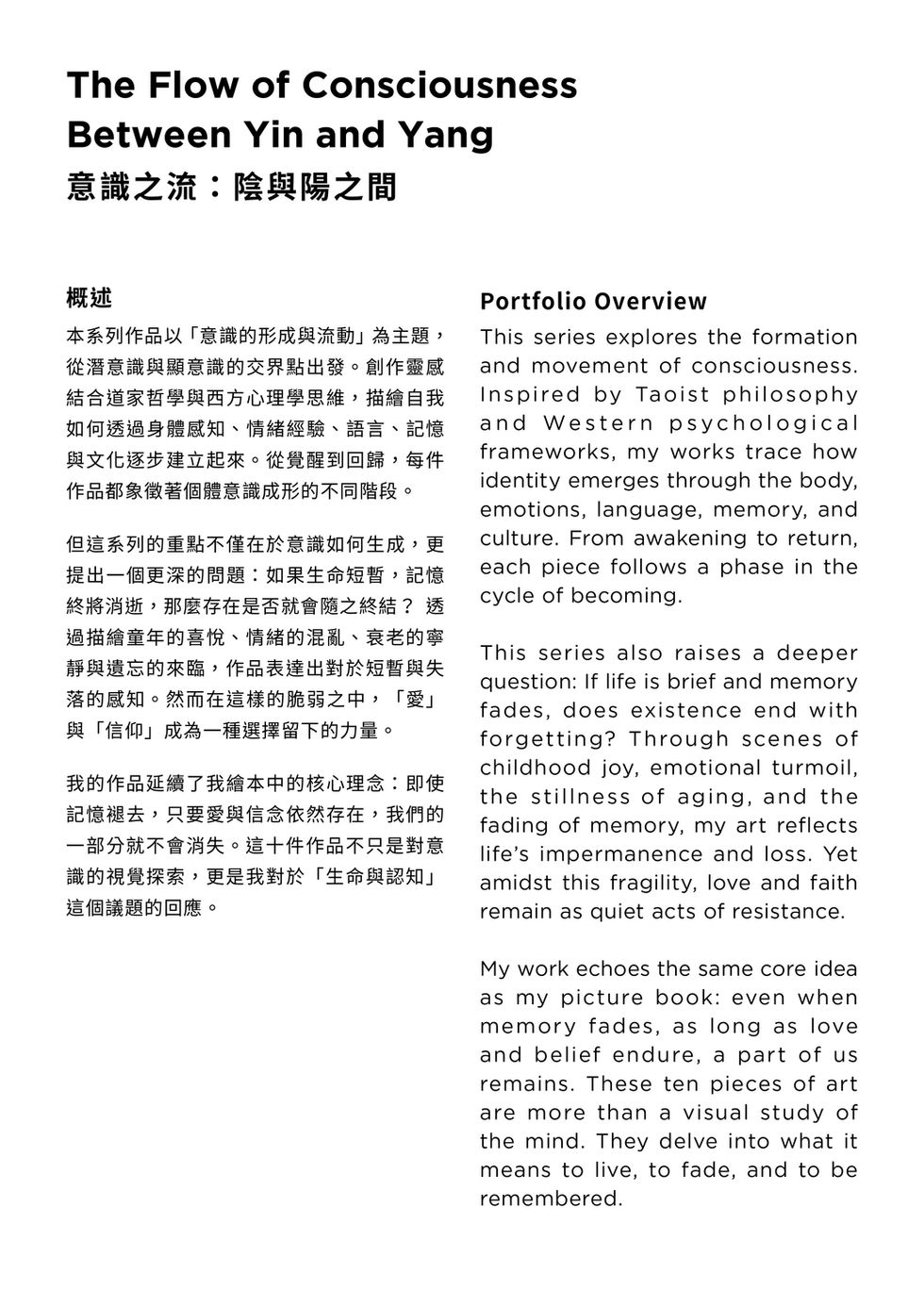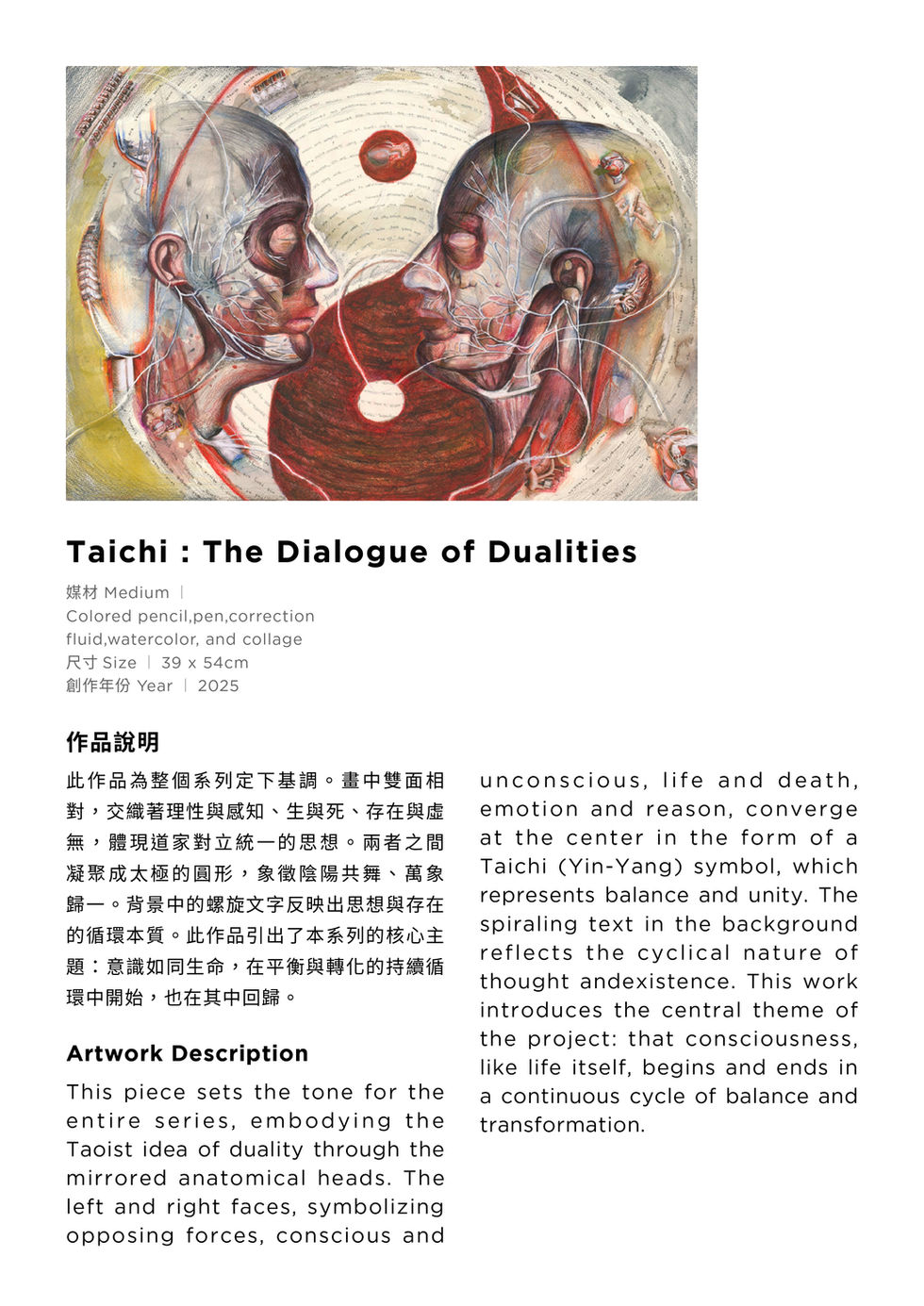 Across ten works, layered compositions merge Eastern symbolism with Western scientific perspectives: the balance of opposites in the Taichi, neuron-like networks branching into thought, mountains as vessels of ancestral memory, and the dissolving forms of fading recollection. These visual narratives invite viewers to contemplate the fragility of life, the inevitability of change, and the forces—love and belief—that allow part of us to endure beyond memory.
